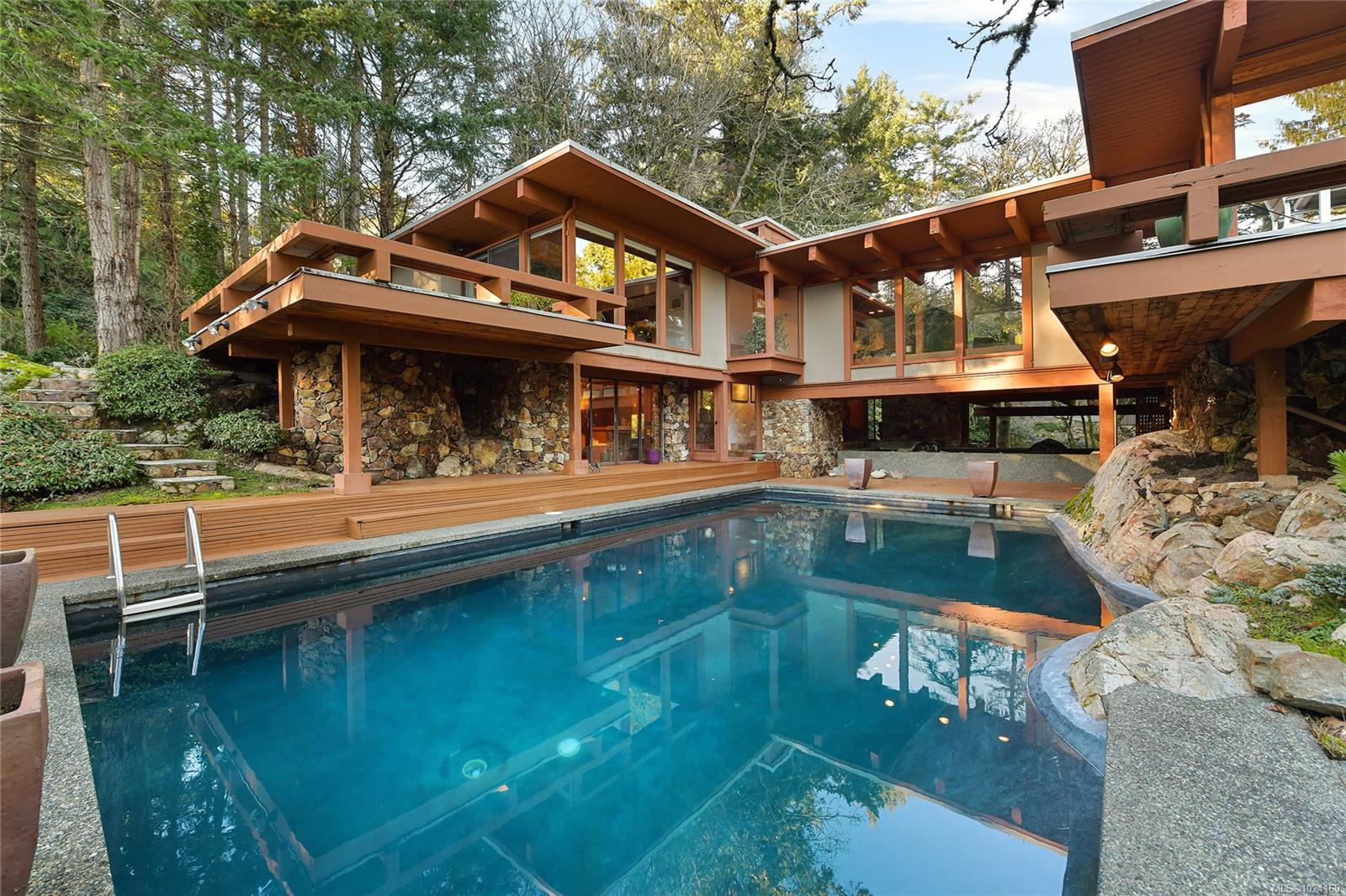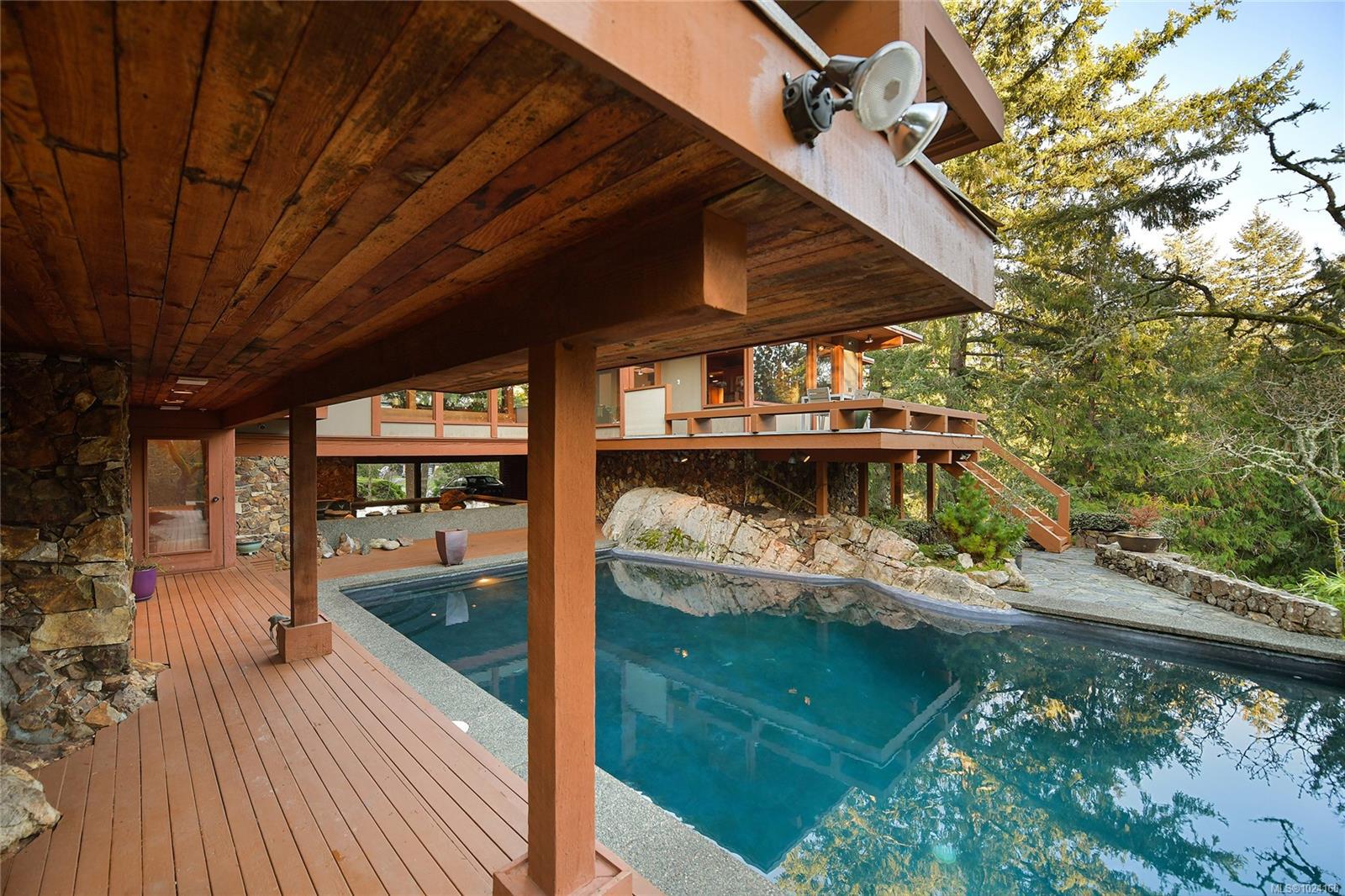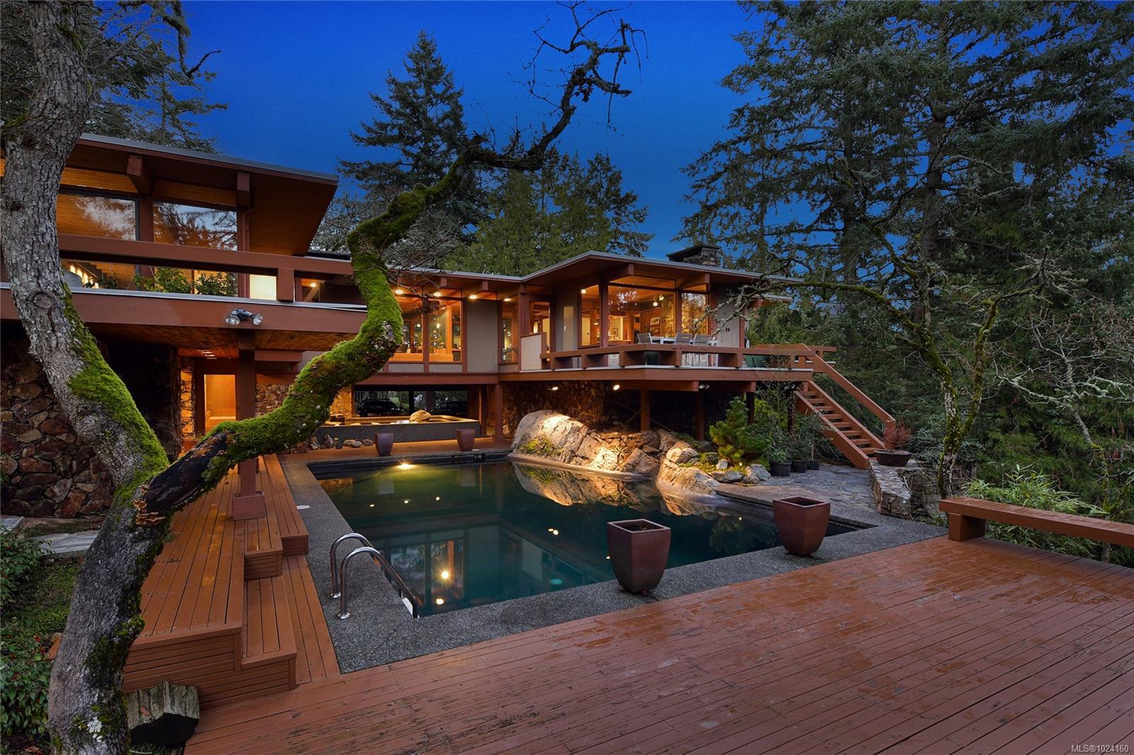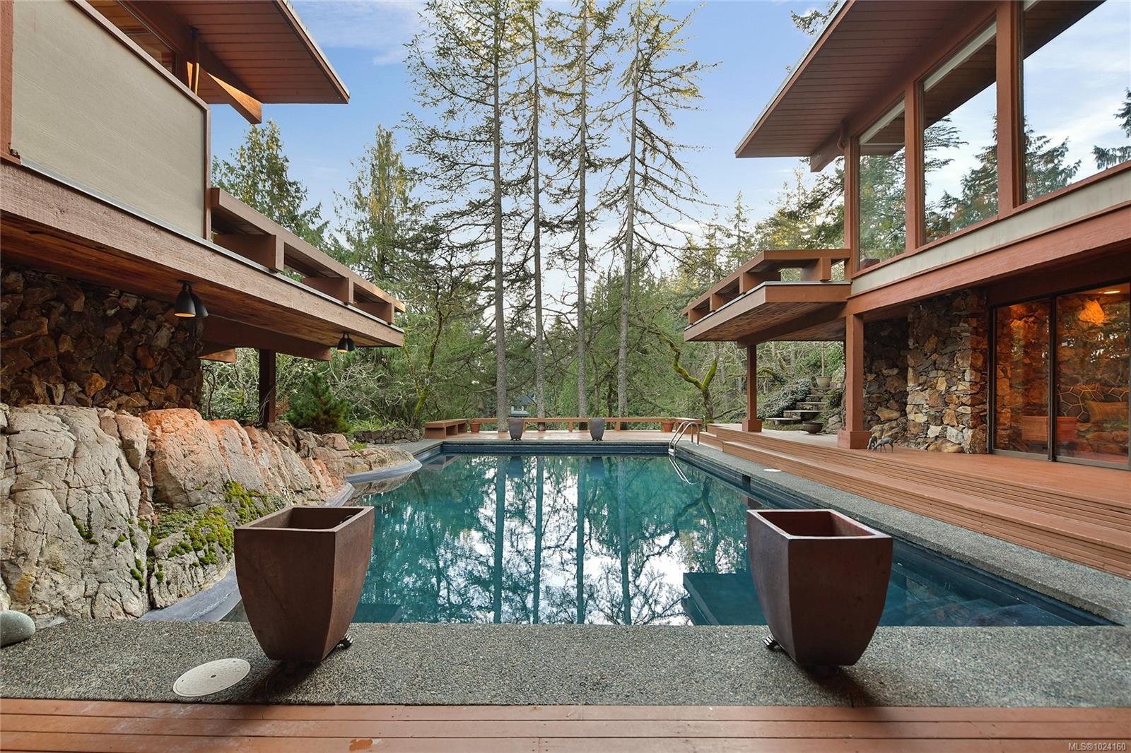 Step into the world of exquisite WEST COAST POST & BEAM architecture with this magnificent residence masterfully crafted by renowned architect Werner Forster with original plans by BROADMEAD's creator, Michael Nixon. A true showcase of 70's inspired design, this executive home is a work of art boasting quality timbers, floor-to-ceiling windows, spacious open plan and a natural pool oasis perfect for entertaining inside & out on the many decks. Perched high to capture breathtaking southern sun exposure, the sprawling layout offers a luxurious primary suite with private hot tub deck, gourmet kitchen, butler's pantry, sunken conversation pit with wood-burning rock fireplace and a media room with a built-in bar showcasing a unique rock feature. Recent upgrades include a commercial-grade gas-fired hot water heater, modern kitchen appliances including WOLF cooktop, upscale thermostats and lighting controls, new low-flow WC's and a cutting-edge home alarm system with remote monitoring. Nestled amidst lush surroundings and close to amenities, this rare gem promises a lifestyle of refinement and elegance not to be missed.