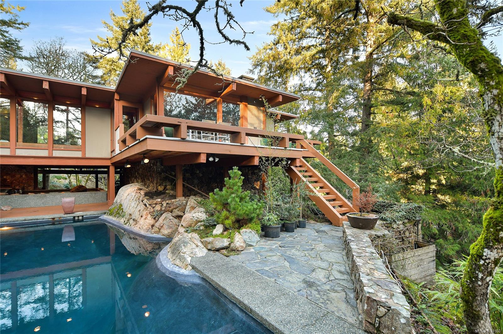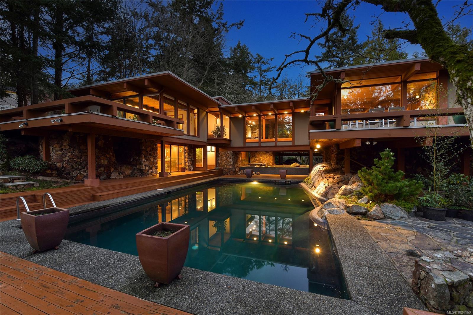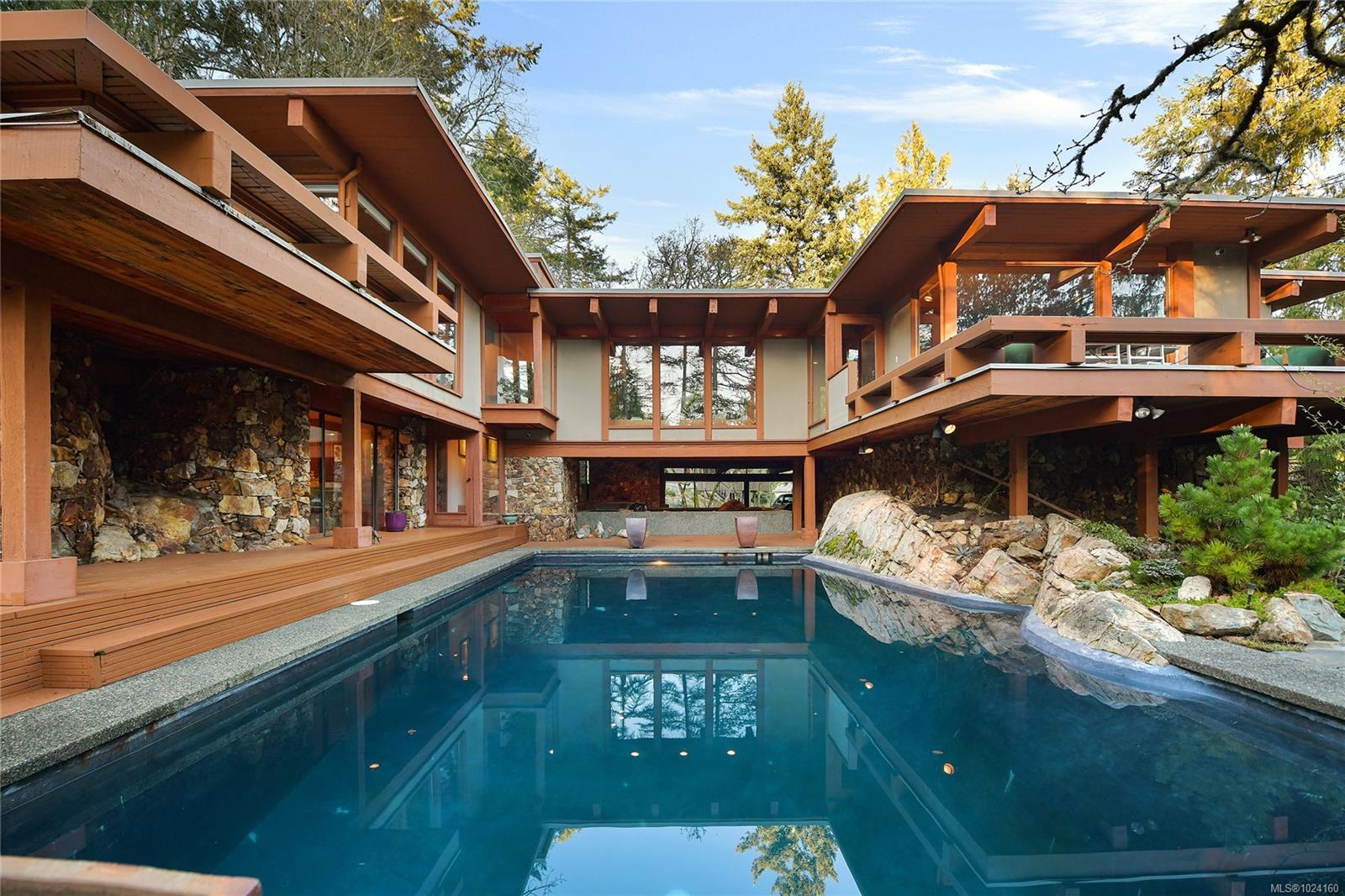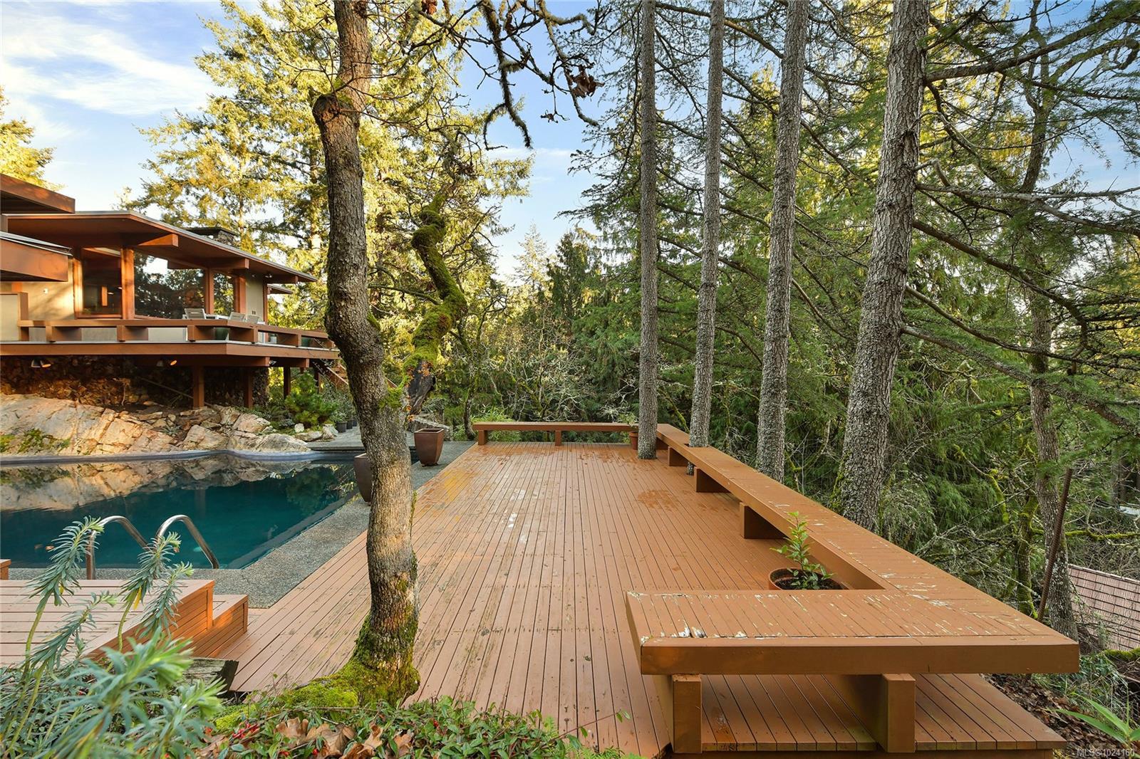 Step into the world of exquisite WEST COAST POST & BEAM architecture with this magnificent residence masterfully crafted by renowned architect Werner Forster with original plans by BROADMEAD's creator, Michael Nixon. A true showcase of 70's inspired design, this executive home is a work of art boasting quality timbers, floor-to-ceiling windows, spacious open plan and a natural pool oasis perfect for entertaining inside & out on the many decks. Perched high to capture breathtaking southern sun exposure, the sprawling layout offers a luxurious primary suite with private hot tub deck, gourmet kitchen, butler's pantry, sunken conversation pit with wood-burning rock fireplace and a media room with a built-in bar showcasing a unique rock feature. Recent upgrades include a commercial-grade gas-fired hot water heater, modern kitchen appliances including WOLF cooktop, upscale thermostats and lighting controls, new low-flow WC's and a cutting-edge home alarm system with remote monitoring. Nestled amidst lush surroundings and close to amenities, this rare gem promises a lifestyle of refinement and elegance not to be missed.