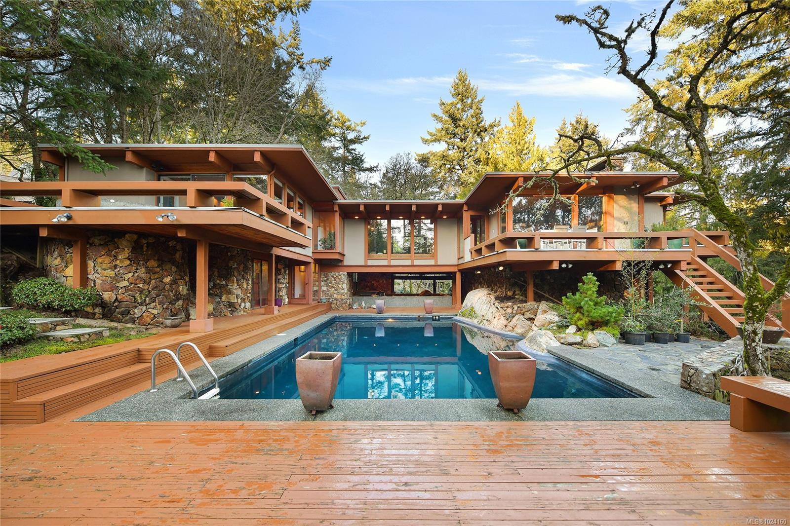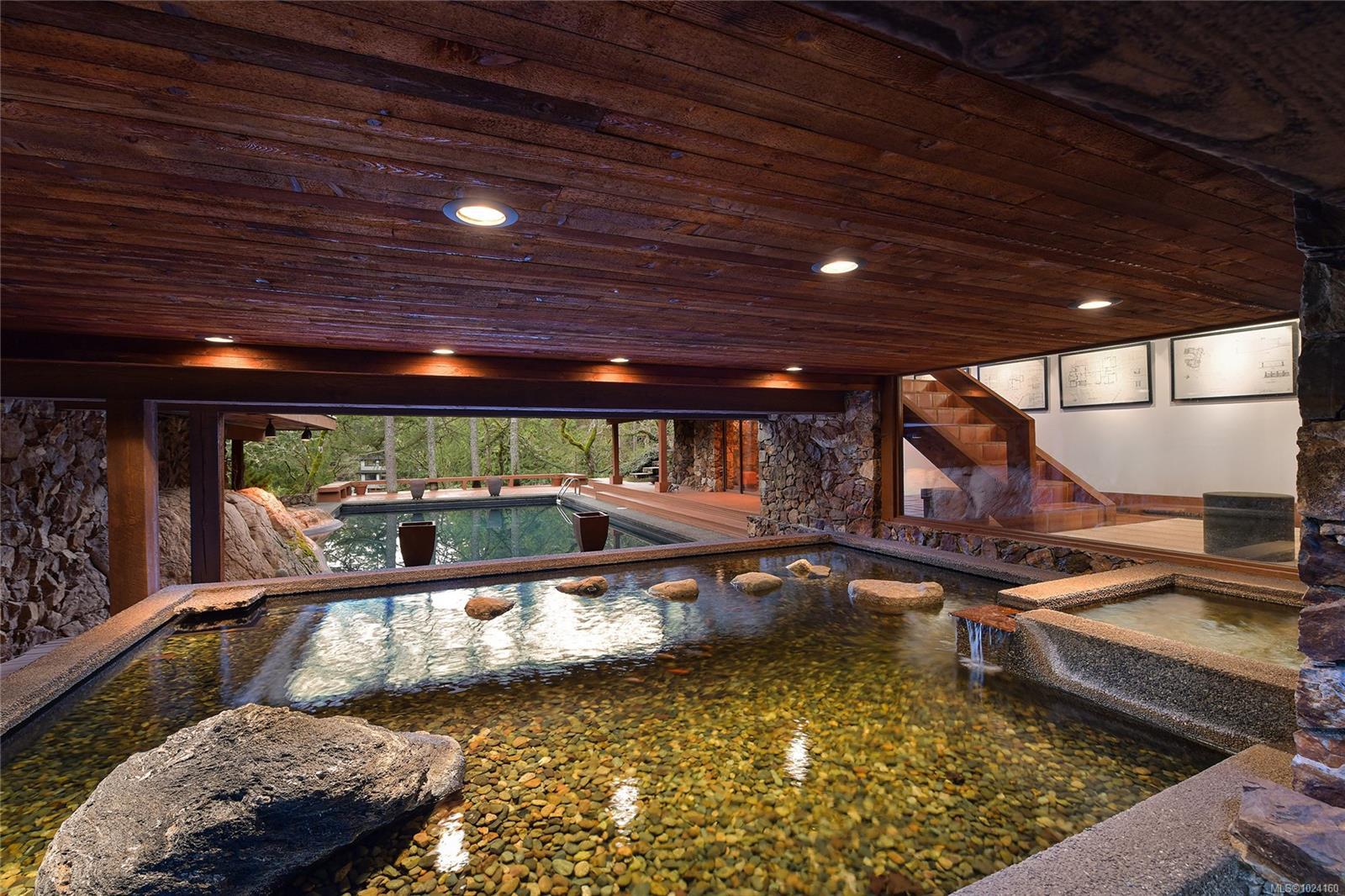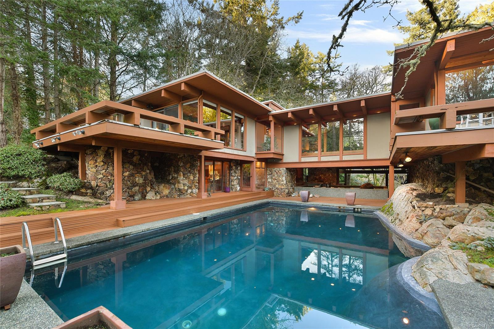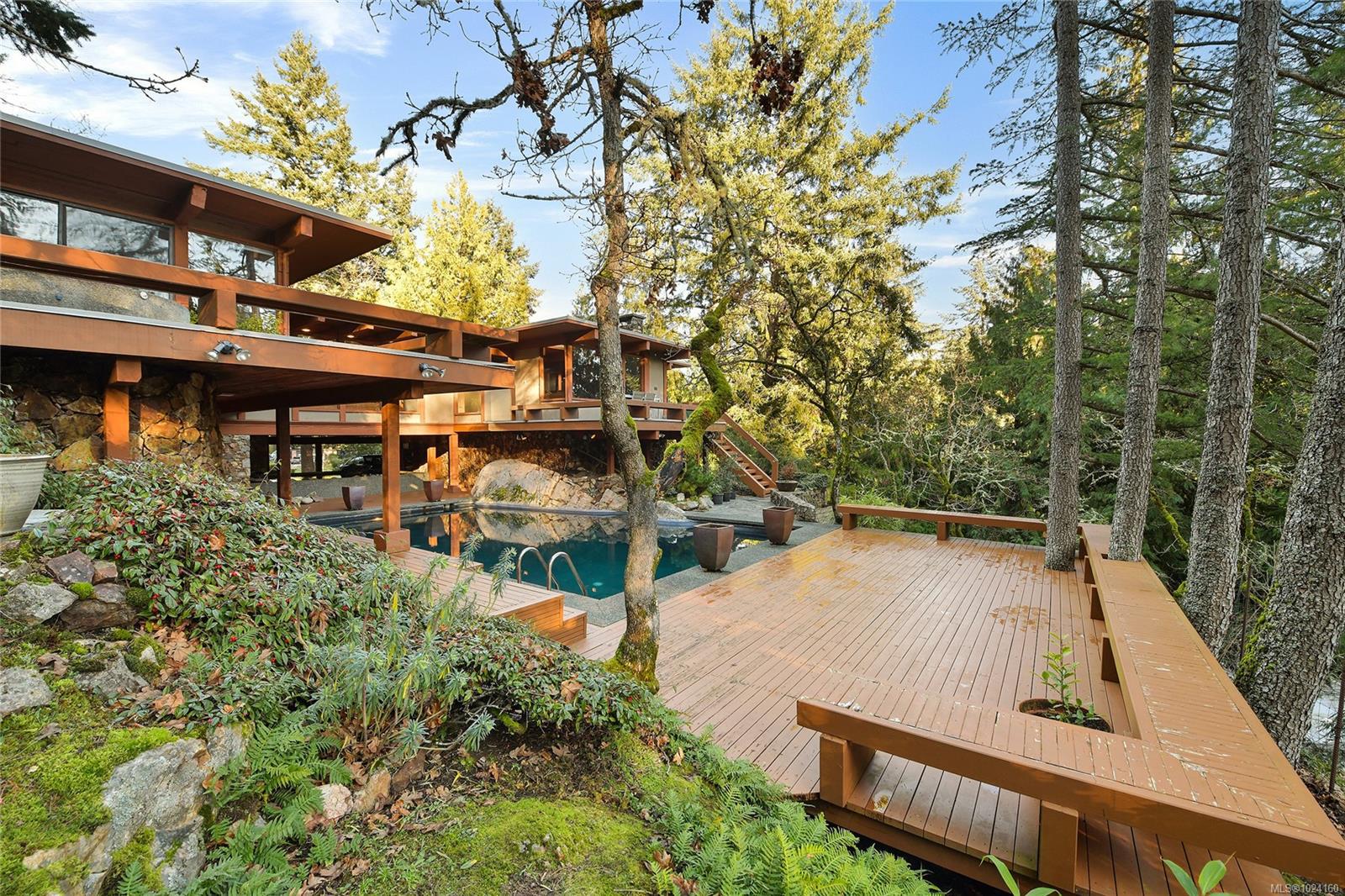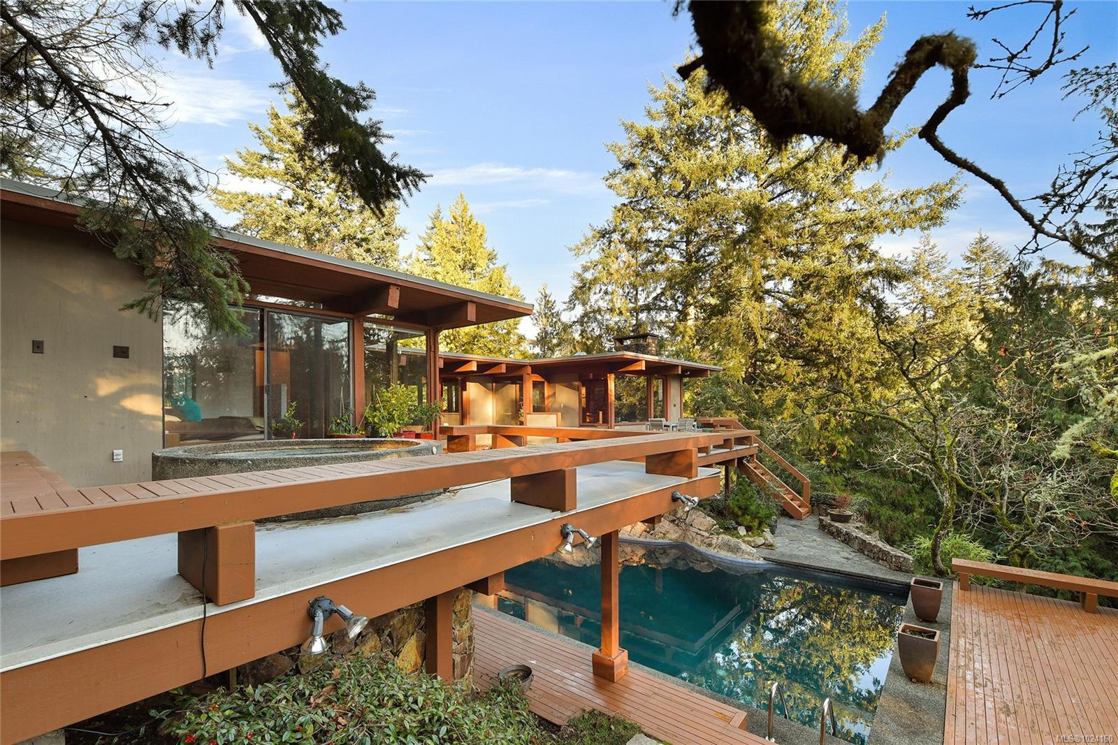 Step into the world of exquisite WEST COAST POST & BEAM architecture with this magnificent residence masterfully crafted by renowned architect Werner Forster with original plans by BROADMEAD's creator, Michael Nixon. A true showcase of 70's inspired design, this executive home is a work of art boasting quality timbers, floor-to-ceiling windows, spacious open plan and a natural pool oasis perfect for entertaining inside & out on the many decks. Perched high to capture breathtaking southern sun exposure, the sprawling layout offers a luxurious primary suite with private hot tub deck, gourmet kitchen, butler's pantry, sunken conversation pit with wood-burning rock fireplace and a media room with a built-in bar showcasing a unique rock feature. Recent upgrades include a commercial-grade gas-fired hot water heater, modern kitchen appliances including WOLF cooktop, upscale thermostats and lighting controls, new low-flow WC's and a cutting-edge home alarm system with remote monitoring. Nestled amidst lush surroundings and close to amenities, this rare gem promises a lifestyle of refinement and elegance not to be missed.